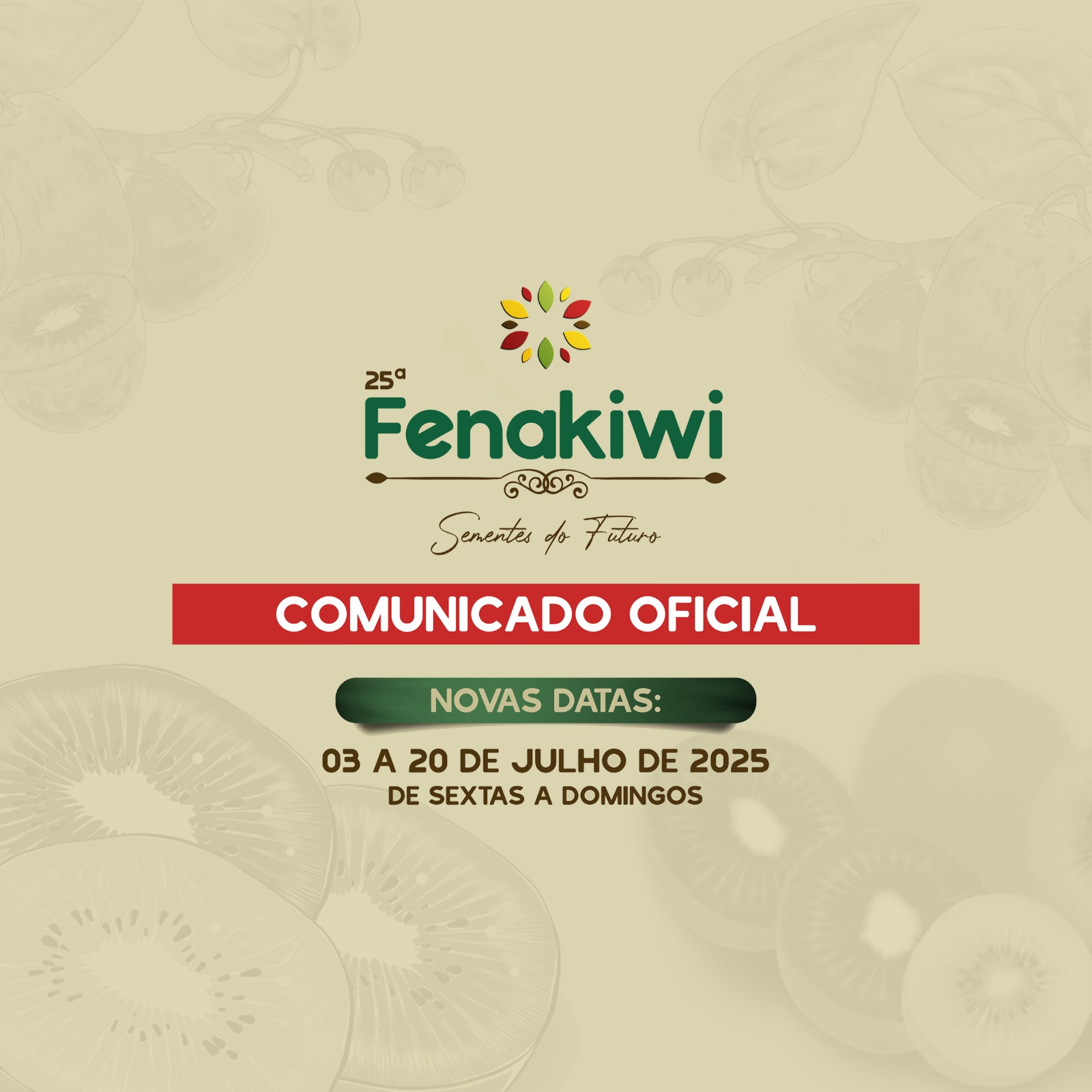 Tendo em vista os eventos climáticos ocorridos em todo o Rio Grande do Sul no início de maio e cujos efeitos perduram e assolam os gaúchos até hoje, o Município de Farroupilha comunica o adiamento da 25ª edição da Fenakiwi para o ano de 2025, no período de 3 a 20 de julho.