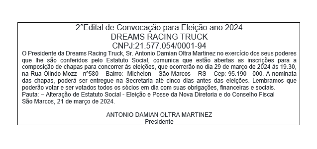 2º Edital de Convocação para Eleição ano 2024 Dreams Racing Truck . Atualizado em 21/03/2024 às 08:03, por Equipe SMO. serragaucha Leia também: Inovação Vacina contra a COVID-19 pode potencializar tratamento contra câncer Pesquisa americana aponta que a tecnologia usada nos imunizantes pode ser uma aliada mente Sabia que existe o luto prolongado? Especialista faz alerta dos sinais e quando buscar ajuda Inovação Unisaúde lança minissérie para pacientes hipertensos em parceria com o Dante Pazzanese Projeto transforma a sala de espera em um espaço de aprendizado sobre prevenção, autocuidado e controle da pressão arterial Tratamentos Cuidado com os seus olhos ao usar "lentes do Halloween" Dr. Leôncio Queiroz Neto faz alerta de cegueira