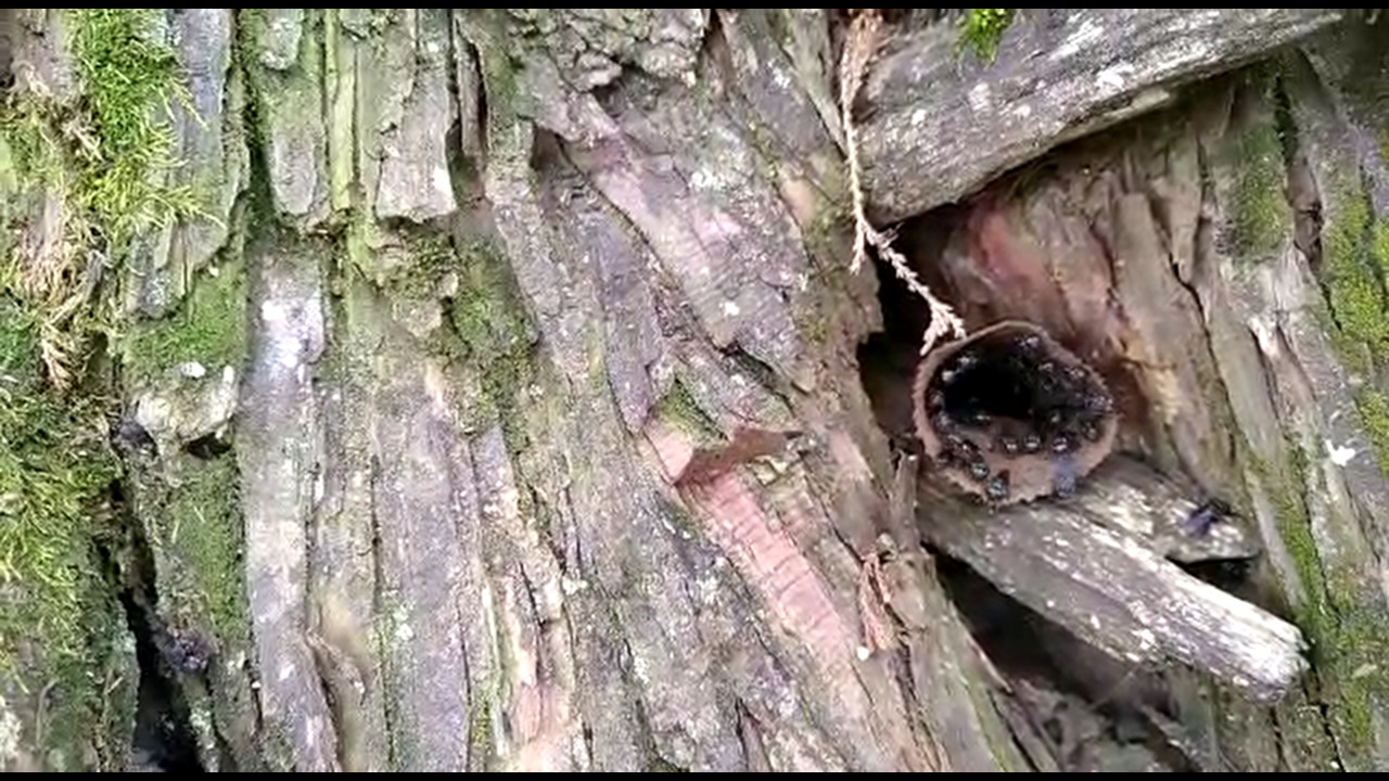O outro ninho está no Parque Municipal Albino Antônio Ruaro. Ali, as jataís escolheram o oco de um grande e antigo bugre, espécie nativa da região e muito procurada por abelhinhas. O pé de bugre e suas jatai estão em cartaz na área de camping do parque. (foto)