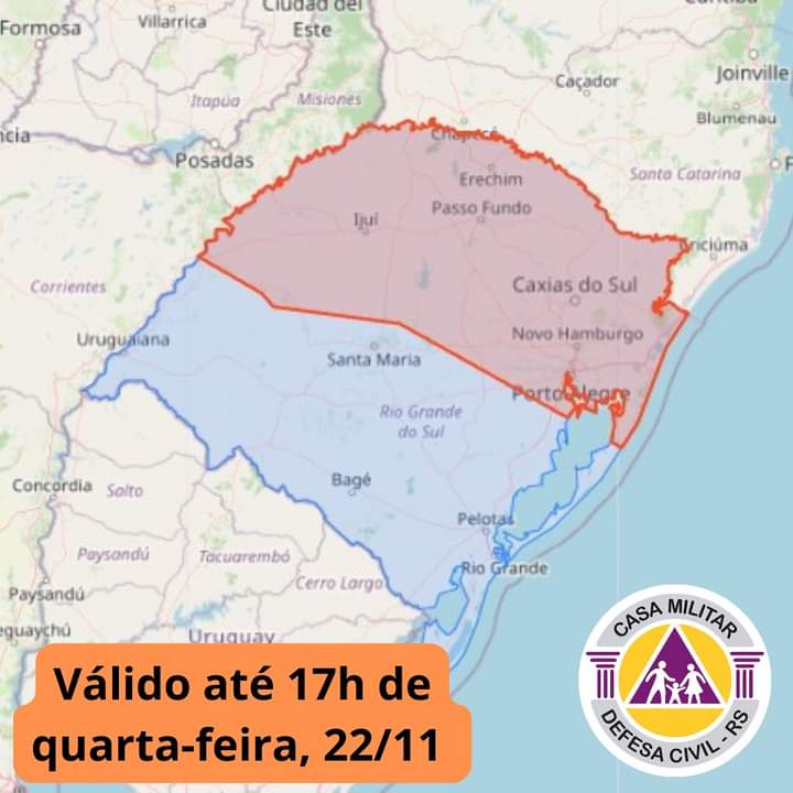 Alerta da Defesa Civil: condições climáticas adversas na área vermelha do mapa