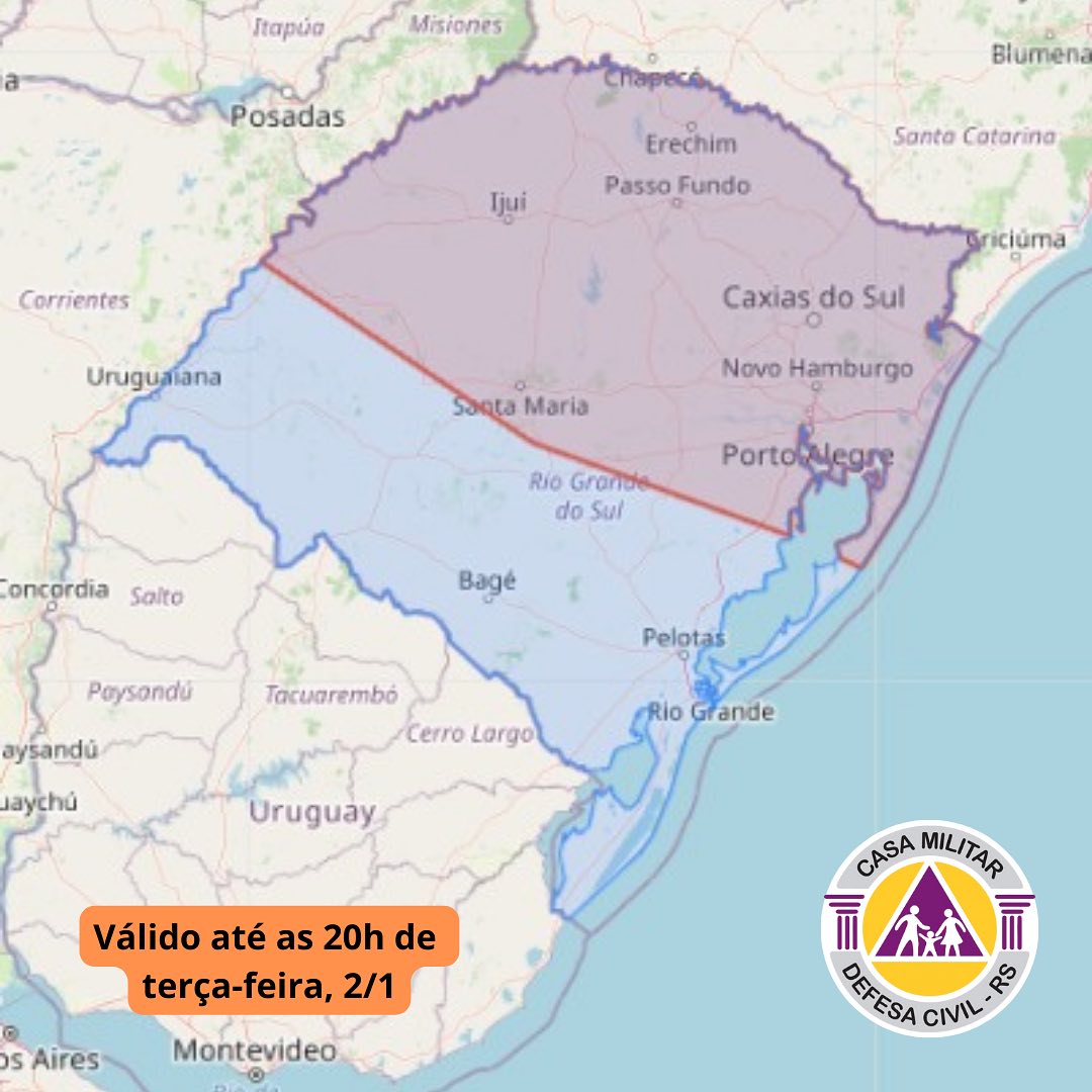 A Defesa Civil do Rio Grande do Sul emitiu um alerta para diversos municípios gaúchos, informando sobre a possibilidade de chuvas intensas, ventos fortes, descargas elétricas e queda de granizo pequeno. O aviso está válido até as 20h desta terça-feira, 2 de janeiro. Em caso de emergência, a população é orientada a ligar para os números de emergência 190/193.