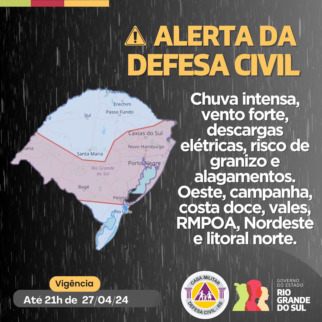 A Defesa Civil emitiu um alerta para a região Oeste, Campanha, Costa Doce, Vales, Nordeste, Região Metropolitana de Porto Alegre e Litoral Norte do Rio Grande do Sul. O aviso, válido até as 21h deste sábado, dia 27 de abril, adverte para a iminência de chuvas intensas, ventos fortes, descargas elétricas, risco de granizo e alagamentos.