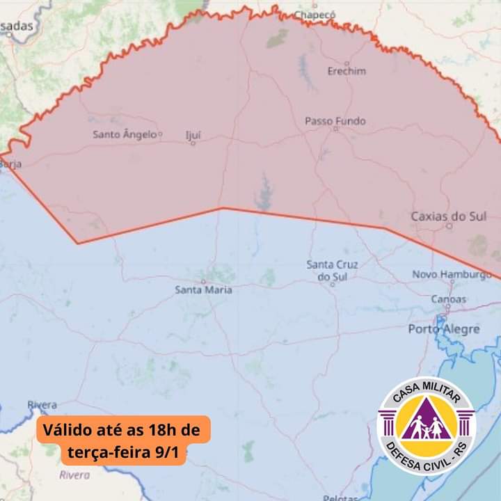 Aviso válido até as 18 horas na área vermelha no mapa A Defesa Civil emitiu um alerta por volta das 10h30desta terça-feira, destacando a possibilidade de chuvas e ventos pontualmente fortes, descargas elétricas e eventual queda de granizo.