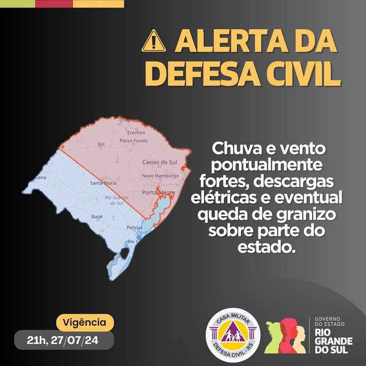 A Defesa Civil emitiu um alerta para a ocorrência de chuvas e ventos pontualmente fortes, descargas elétricas e possível queda de granizo, válido até as 21h deste sábado. A população deve ficar atenta e adotar medidas de segurança.
