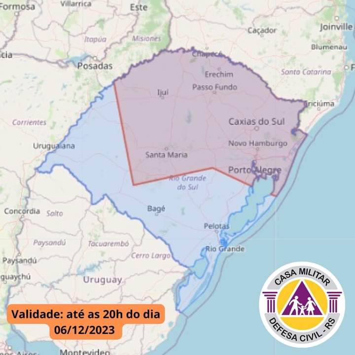 A Defesa Civil emitiu um alerta para chuvas pontualmente fortes, descargas elétricas, eventual queda de granizo e vento intenso, válido até as 20h desta quarta-feira. A população é orientada a permanecer em alerta e adotar medidas preventivas para garantir a segurança.