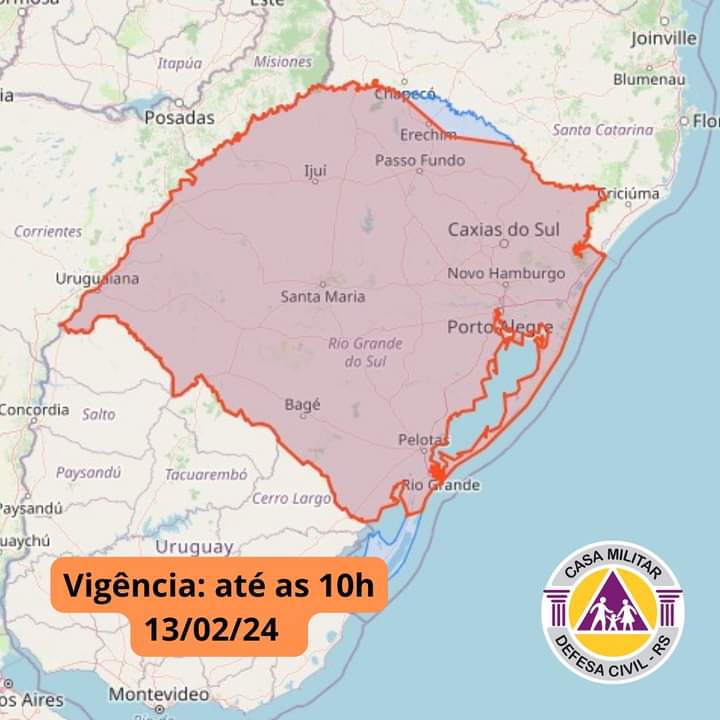 O Rio Grande do Sul encontra-se em estado de atenção devido ao alerta de chuvas e ventos pontualmente fortes, descargas elétricas e eventual queda de granizo. O alerta, válido até as 10 horas desta terça-feira (13), foi emitido às 20h30 pela Defesa Civil Estadual.