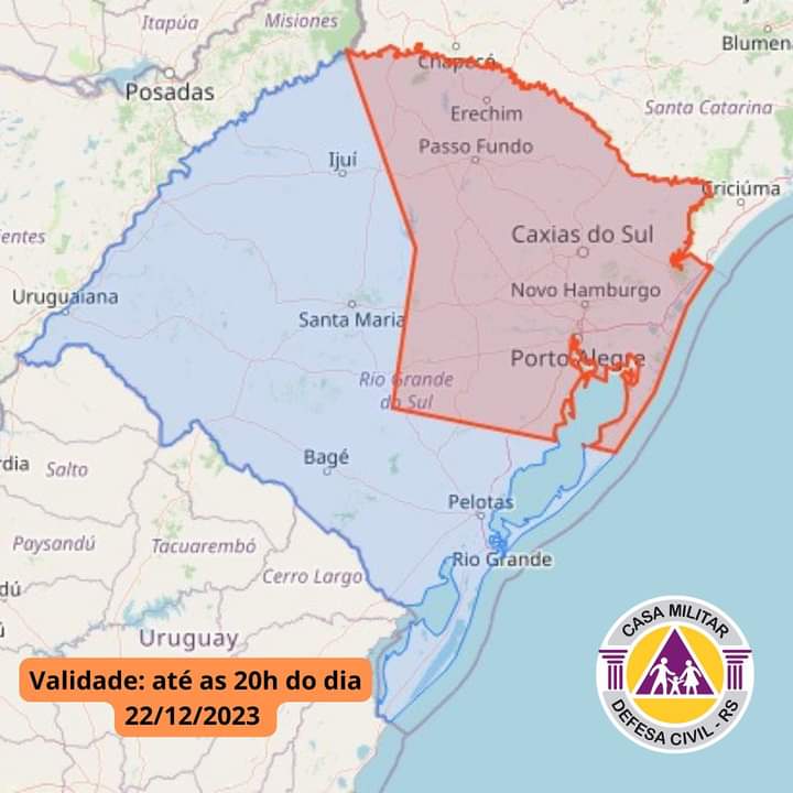 Alerta válido para a área em vermelho no mapa A Defesa Civil emitiu um alerta meteorológico por volta das 17 horas desta sexta-feira, informando sobre a possibilidade de temporais com chuvas intensas, ventos fortes, descargas elétricas e eventual queda de granizo. O aviso é válido até as 20 horas na área em vermelho no mapa.