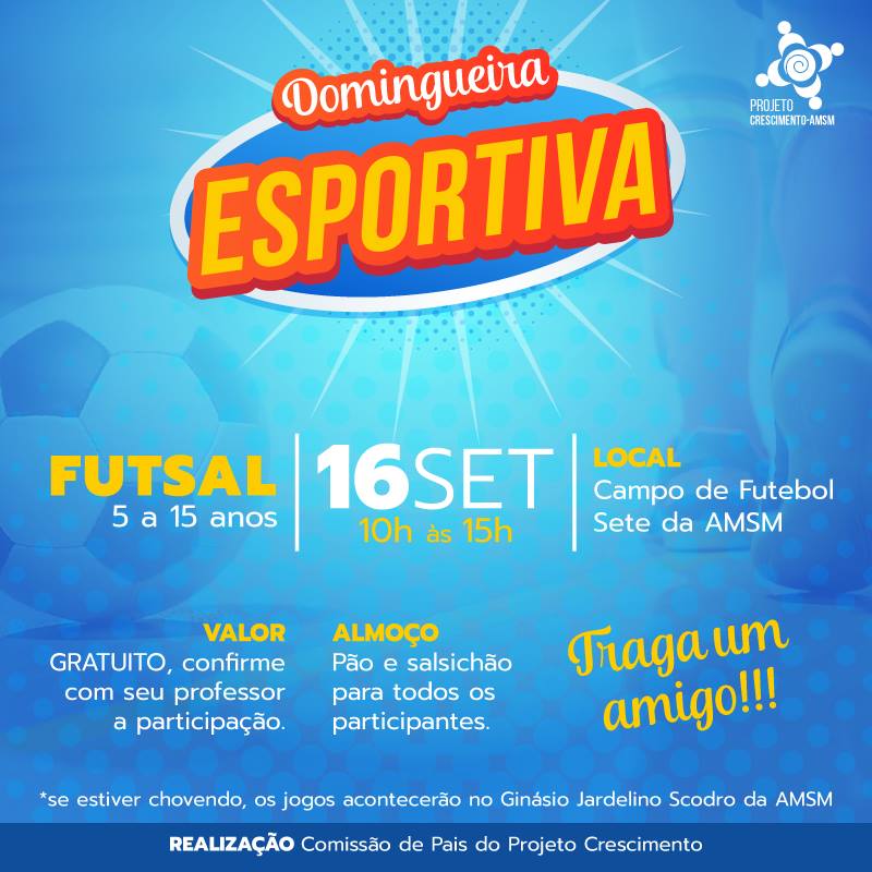 O Projeto Crescimento da AMSM é um dos maiores projetos voltados ao esporte da cidade de São Marcos, e através deste reconhecimento a Comissão de Pais do Projeto estão promovendo o Domingueira Esportiva, que será um evento voltado a crianças de 5 a 15 anos com o futsal sendo o carro chefe.
