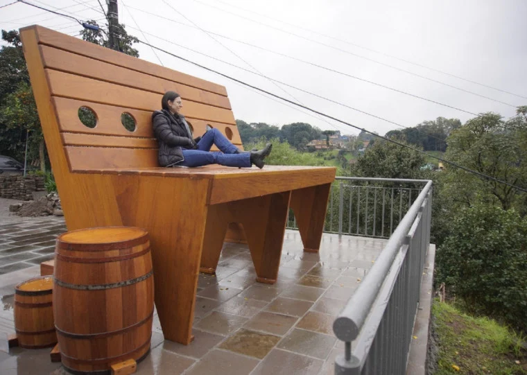 Localizado na escadaria da fé, na Rua dos Imigrantes, o banco possui 2 metros e 40 centímetros de altura e 3 metros de largura