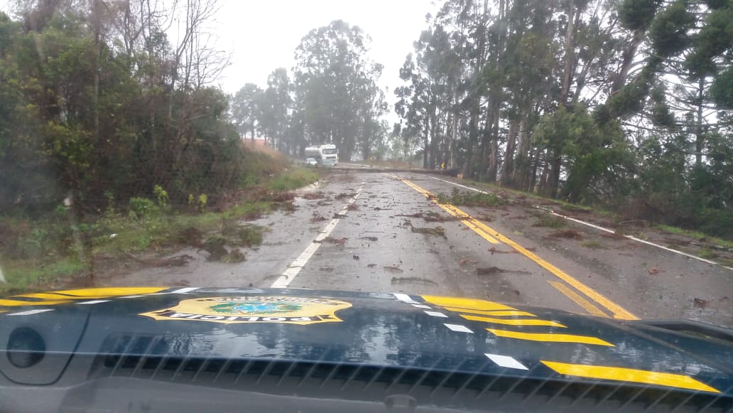 Há pouco, o trânsito no km 70 da BR 116 em Campestre da Serra e que estava totalmente obstruída foi liberado pela PRF com auxílio de maquinário da prefeitura daquela cidade. Equipe do Dnit também esteve no local e agora seguem em averiguação de nova queda de árvore no km 42, em Vacaria, aonde também foram registrados destelhamentos.
