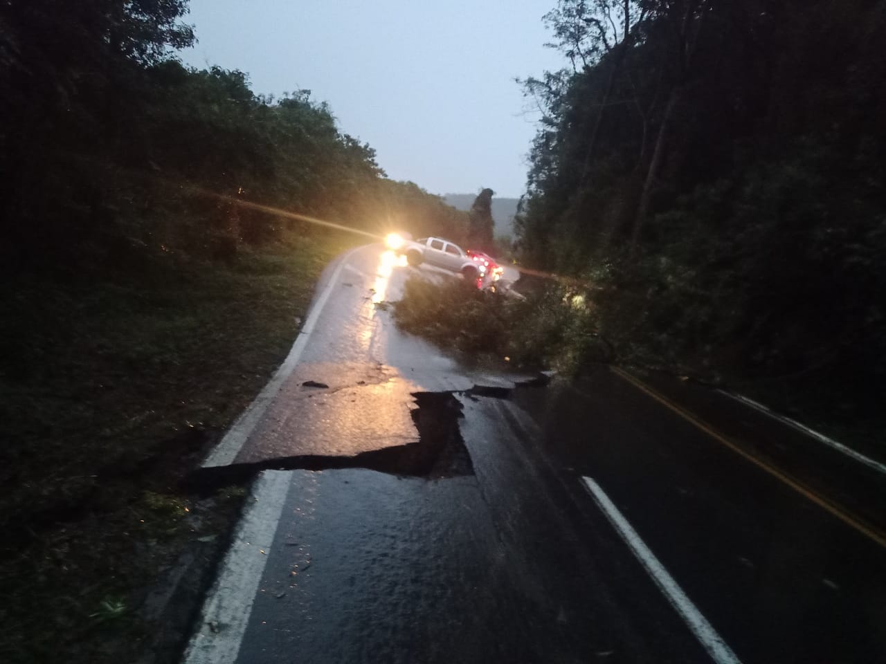 De acordo com as equipe de segurança, desnível é de mais de 60 centímetros. A intensa chuva que assola o Estado resultou em mais danos nas estradas de São Marcos.