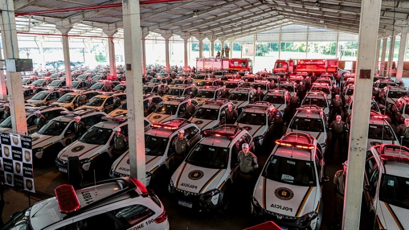 Ato de entrega de 272 viaturas para a Brigada Militar e 89 carabinas para a Polícia Civil aconteceu nesta segunda-feira (27), em cerimônia no Parque de Exposições Assis Brasil, em Esteio