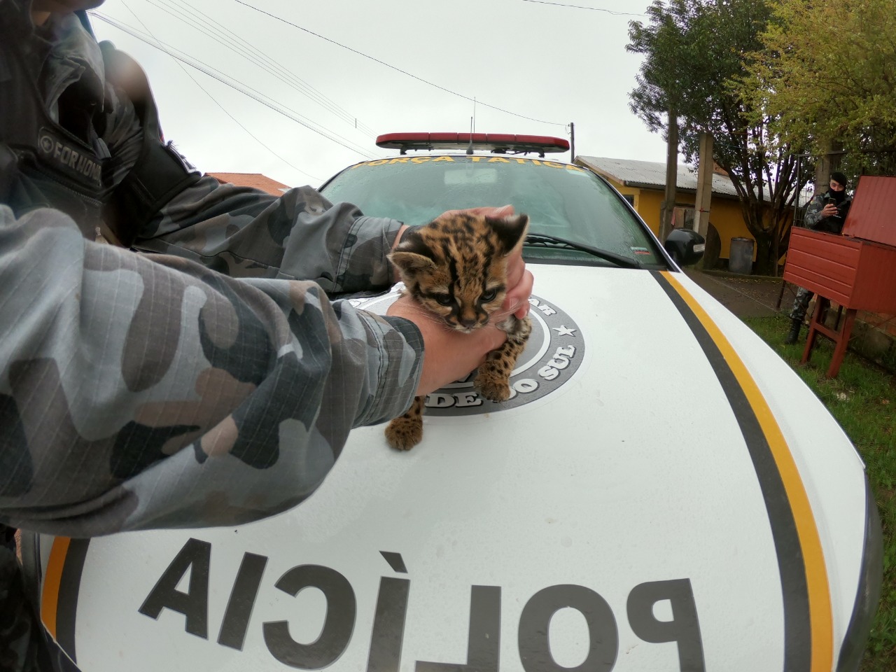 O filhote de gato-maracajá estava em uma gaiola. Um homem foi autuado por crime ambiental Após denúncias de que no pátio de uma residência no bairro Barcelos, em Vacaria, estava sendo mantido dentro de uma gaiola um felino selvagem, Policiais Militares da Força Tática do 10º BPM realizaram ação na tarde desta segunda-feira, dia 14.