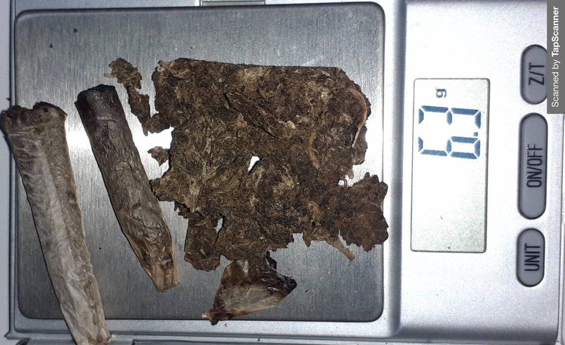 Em revista pessoal nada foi encontrado, mas em revista veicular foram localizados 2 cigarros de maconha no asoalho do carona pesando 1.2g e uma porção de maconha no console central pesando 5.0g de substâncias com características de maconha, o individuo relatou ser o propietario da maconha.