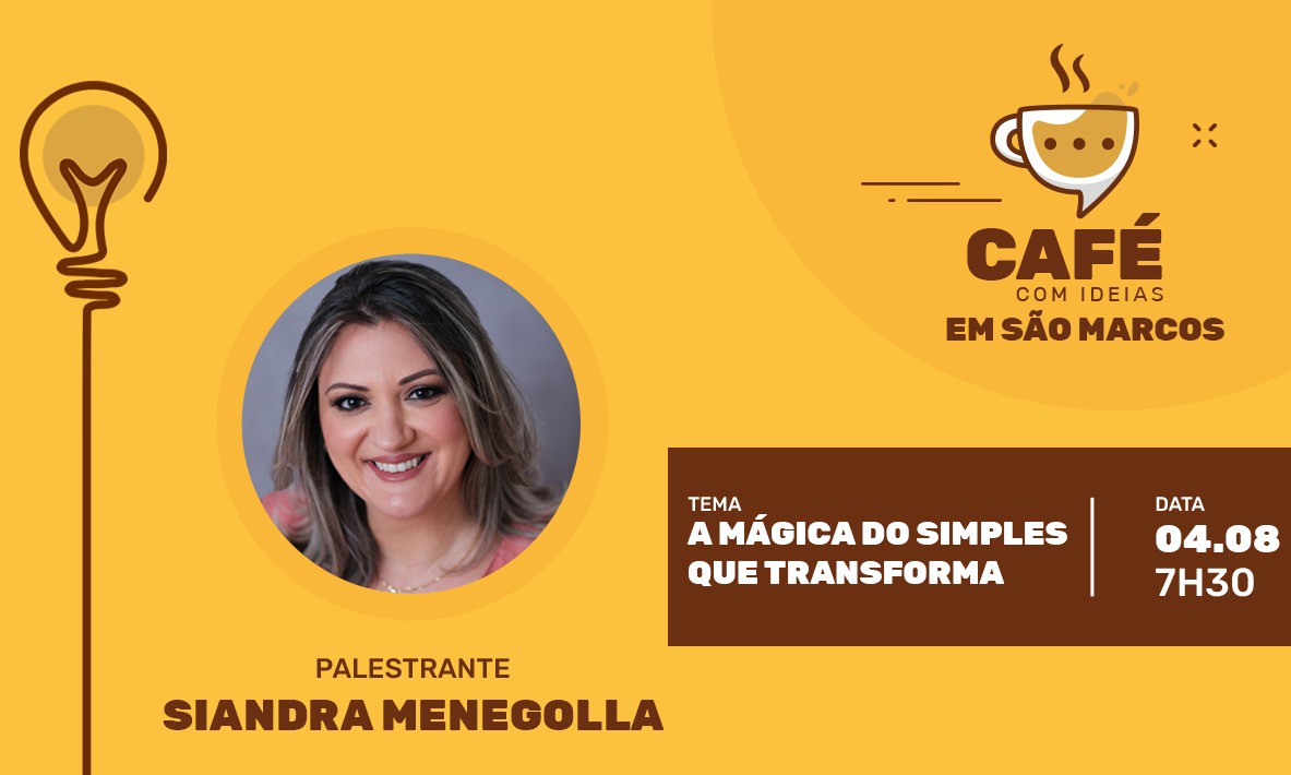 O segundo semestre de 2022 inicia com a palestra “A mágica do simples que transforma”, com Siandra Menegolla, na quinta-feira, dia 04.08 O Sindilojas Caxias traz para o Café com Ideias de São Marcos a palestra “A mágica do simples que transforma” com a palestrante convidada, a Head Trainer e Master Coach em Inteligência Emocional, Siandra Araldi Menegolla.