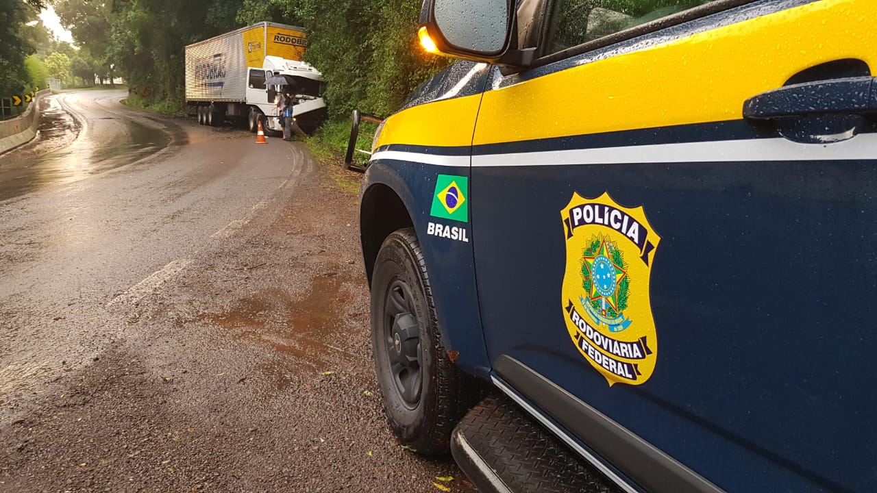 PRF registrou acidente por volta das 19h desta quinta-feira (13). Condutor teve lesões leves. Conforme informações da Polícia Rodoviária Federal, a carreta saiu da pista e acabou chocando-se contra o barranco no km 130 da BR 116, próxima a Ponte do Rio São Marcos, entre São Marcos e Caxias do Sul.