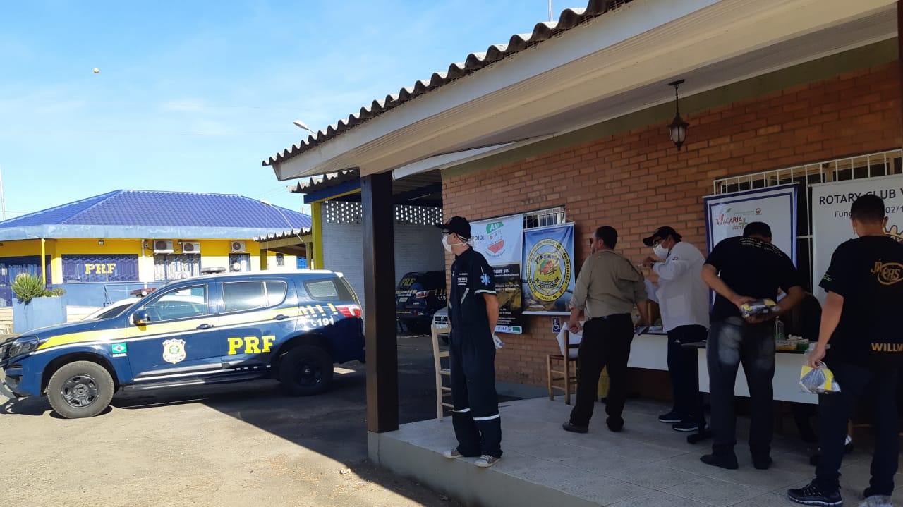Em uma ação conjunta da Polícia Rodoviária Federal e da Secretaria Municipal da Saúde, com apoio da Guarda Municipal, Unimed, Associação dos Motoristas e do Rotary Club de Vacaria, foi montado na manhã deste sábado (25) um ponto de vacinação para os caminhoneiros junto à Unidade Operacional da PRF em Vacaria. Foram aplicadas 300 vacinas e distribuídos 350 kits contendo álcool gel, máscaras e outros itens de higiene aos motoristas.