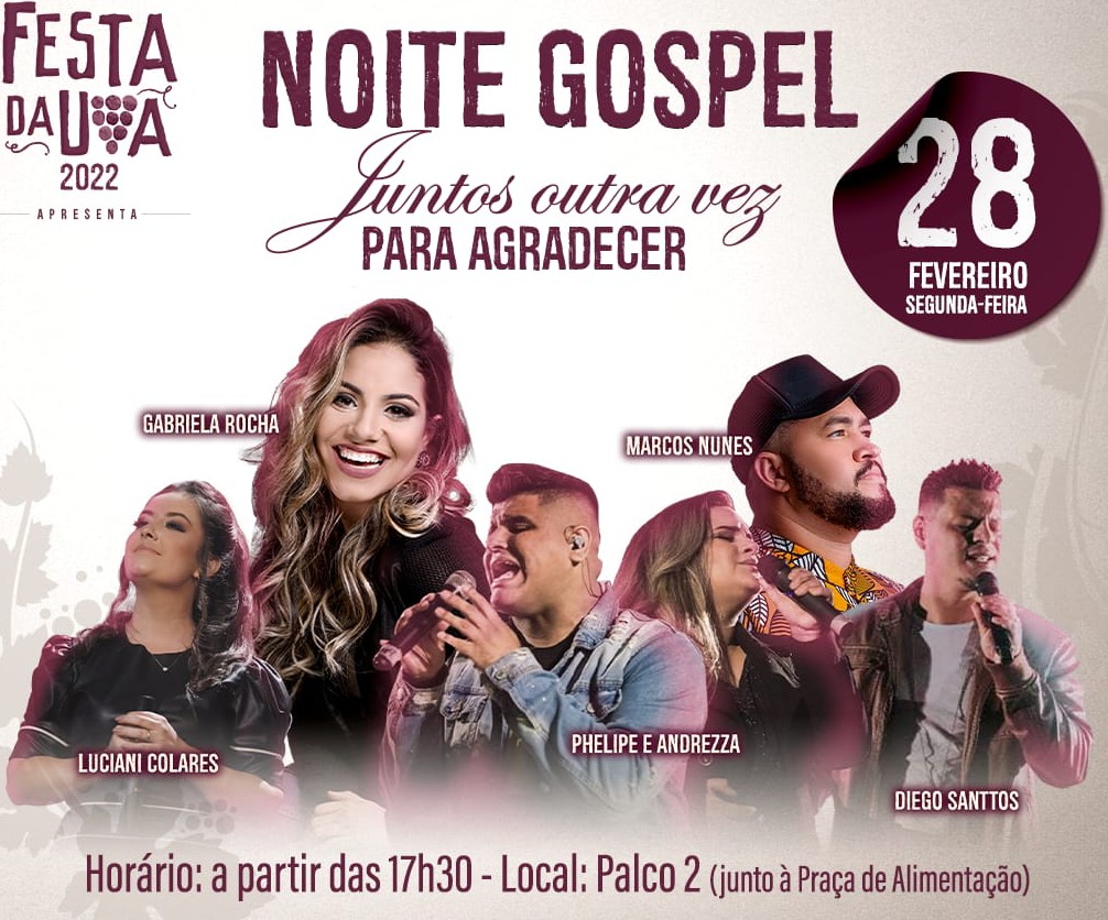 Atrações do evento, que ocorre dia 28 de fevereiro, foram apresentadas na tarde deste sábado Com o tema “Juntos Outra Vez para Agradecer”, a Comissão Comunitária da Festa da Uva e o Conselho de Igrejas Evangélicas de Caxias do Sul lançaram na tarde de sábado (08/01), a Noite Gospel da 33ª Festa da Uva.