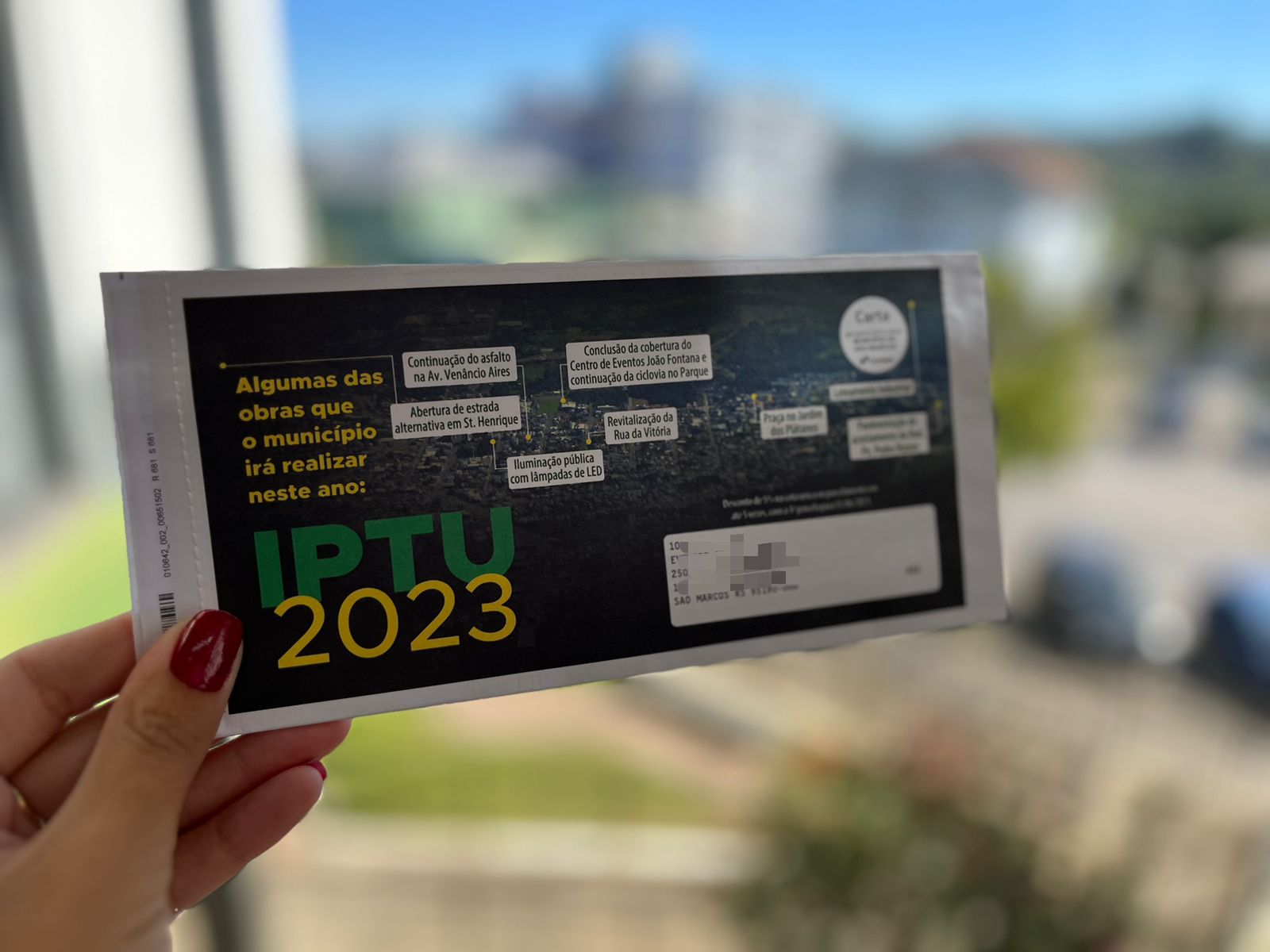 Pagamento deve ser feito nos bancos, em estabelecimentos credenciados ou via aplicativos Iniciou nesta quinta-feira a distribuição dos carnês do IPTU e/ou Taxa de Coleta de Lixo 2023. O vencimento da cota única será dia 15 de junho, com desconto de 5%.