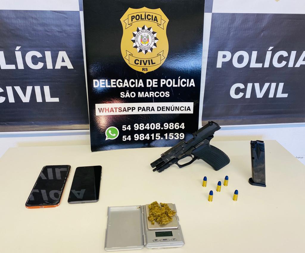 Na manhã desta terça-feira (24) a Polícia Civil de São Marcos, prendeu um homem e uma mulher por tráfico de drogas, associação para o tráfico e posse ilegal de arma de fogo de uso restrito (raspada).