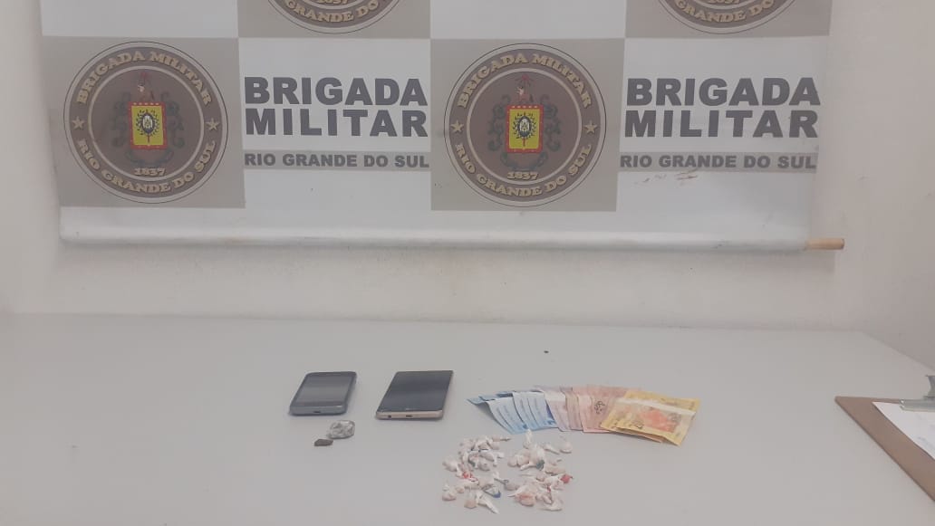 Durante patrulhamento de rotina pelo bairro São José a guarnição abordou uma mulher de 22 anos e um homem de 25 anos. O casal andava a pé pela via e com eles foi encontrado R$ 100,25 em trocados, além de 59 pedras de crack pesando 11,8g, uma porção de maconha pesando 2,8g e dois celulares.