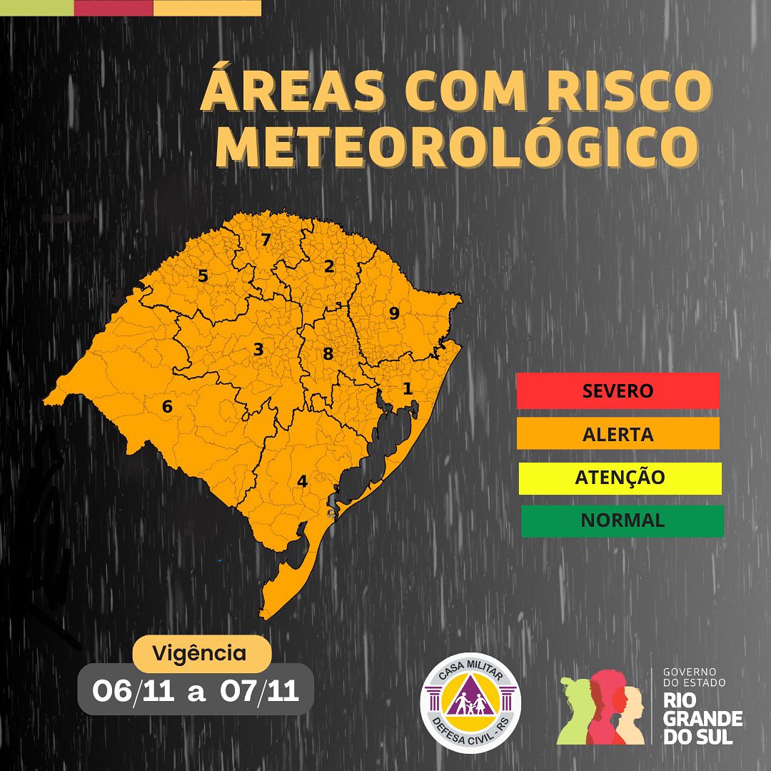 De acordo com a Defesa Civil, há risco de alagamentos e granizo A Sala de Situação atualizou a previsão do tempo para esta quarta-feira (06) e quinta-feira (07) de novembro, indicando condições meteorológicas adversas em praticamente todas as regiões do Rio Grande do Sul.