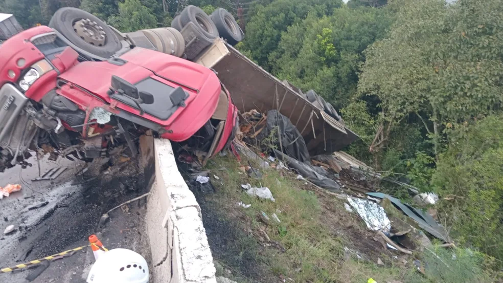 O impacto da batida foi extremamente violento: um dos caminhões tombou e o outro, pertencente a uma empresa de laticínios, teve a cabine completamente destruída. Parte da carga ficou espalhada pela pista, dificultando ainda mais a circulação no local.