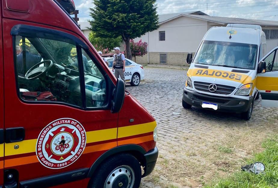Acidente ocorreu por volta do meio-dia no bairro Francisco Doncato As equipes de resgate de São Marcos foram acionadas por volta do meio-dia desta quinta-feira (23) para atender uma colisão envolvendo uma van escolar e uma moto. O SAMU fez o primeiro atendimento ao condutor da moto, um jovem de 18 anos.