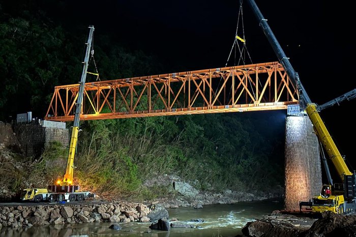 A segunda parte da estrutura metálica foi içada sobre os pilares de concreto nesta semana, marcando uma etapa crucial no processo de reconstrução. A empresa responsável agora concentra esforços na concretagem da pista de rolamento, prevista para ser concluída até a sexta-feira, 29 de dezembro.