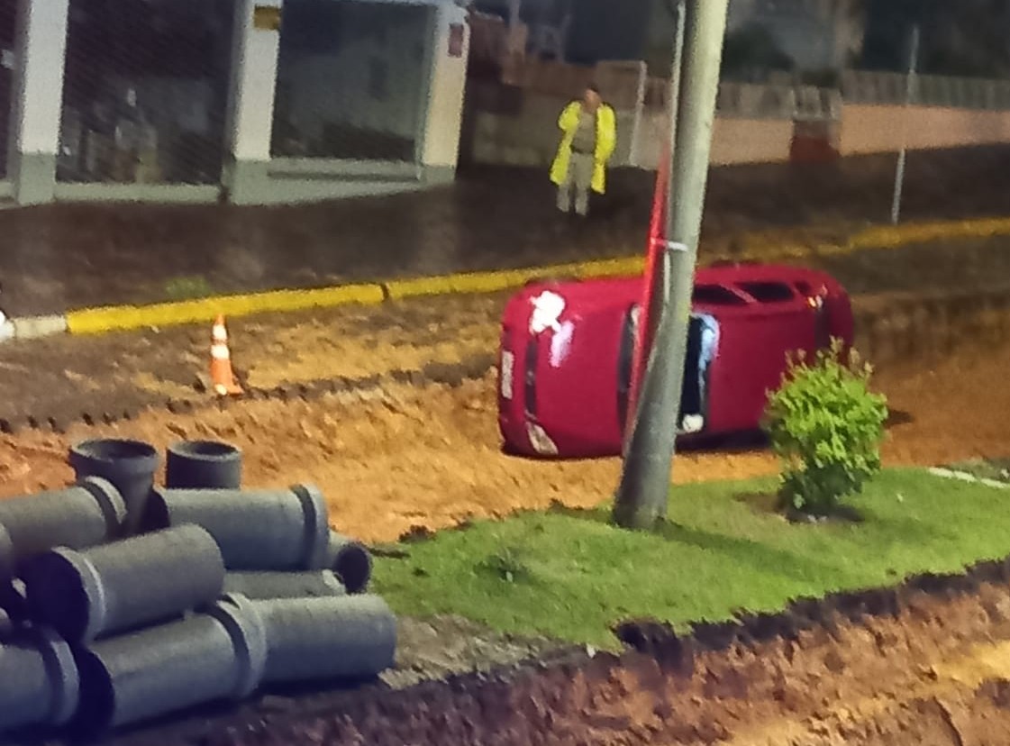 No final da tarde deste domingo, por volta das 18h30, as equipes de segurança foram acionadas para averiguar sobre um veículo que estaria caído em um valo aberto para recuperação da via, na Avenida Venâncio Aires.