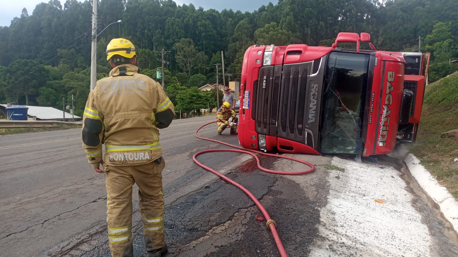 Um caminhão Scania carregado de brócolis tombou em São Marcos na tarde desta quinta-feira (2). Por volta das 16h a equipe dos corpo de bombeiros foi acionada para atender a ocorrência no km 112, no bairro Michelon.