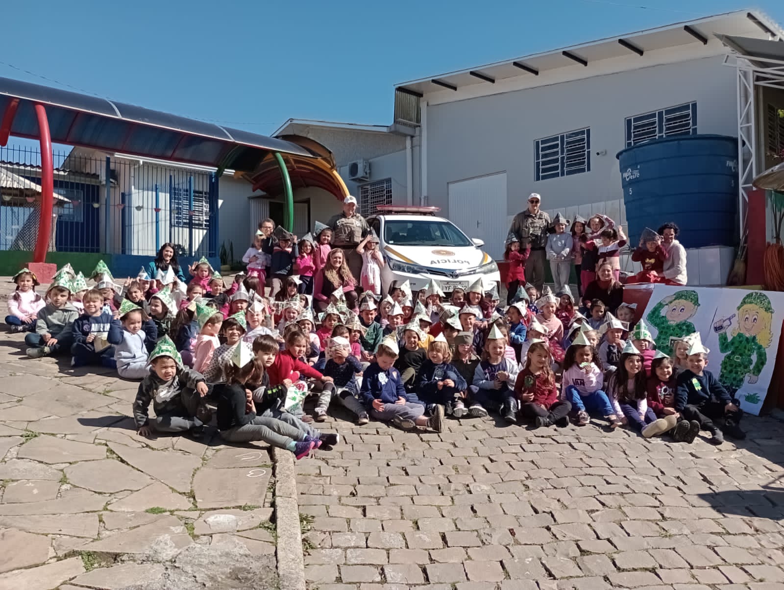 A escola conta com 174 alunos com idade entre quatro (04) e cinco (05) anos, divididos nos turnos da manhã e tarde, e preparou uma decoração toda especial para receber os integrantes da Brigada Militar.
