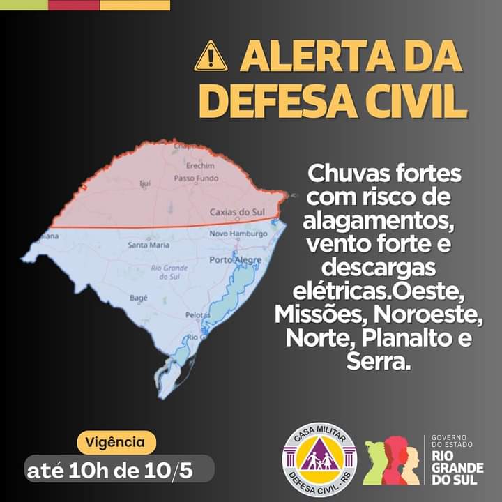 O alerta é válido até as 10 horas desta sexta-feira na área em vermelho no mapa A Defesa Civil emitiu um alerta para chuvas intensas, vento forte e descargas elétricas, válido até as 10h desta sexta-feira.