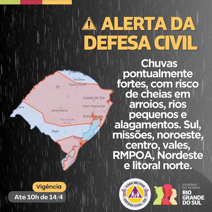 Alerta vale até as 10 horas deste domingo A Defesa Civil alerta para a ocorrência de chuvas pontualmente fortes, com risco de cheias em arroios, rios pequenos e possíveis alagamentos, válido até as 10h deste domingo, dia 14 de abril. Durante esse período, é fundamental que a população esteja atenta e tome medidas de segurança.