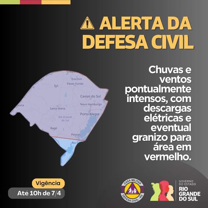 O alerta está em vigor até as 10h de domingo, 7 de abril A Defesa Civil do Rio Grande do Sul emitiu um alerta para a ocorrência de chuvas e ventos pontualmente intensos, com descargas elétricas e eventual queda de granizo na área demarcada em vermelho no mapa.