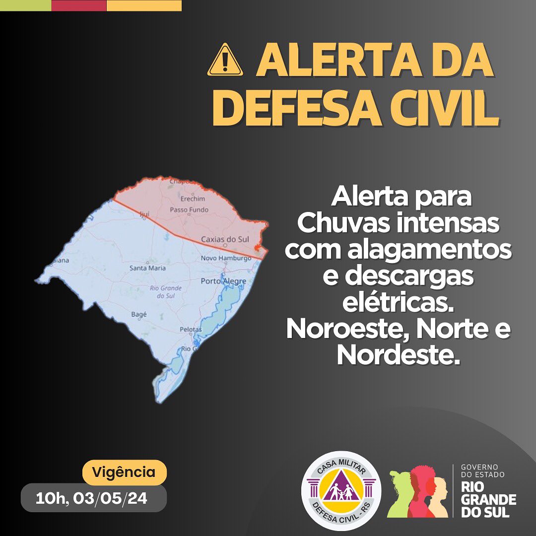 Alerta é válido até as 10 horas desta sexta-feira A Defesa Civil emitiu um alerta para chuvas intensas, acompanhadas de alagamentos, ventos fortes, descargas elétricas e risco de granizo, válido até às 10h desta sexta-feira na região Noroeste, Norte e Nordeste.