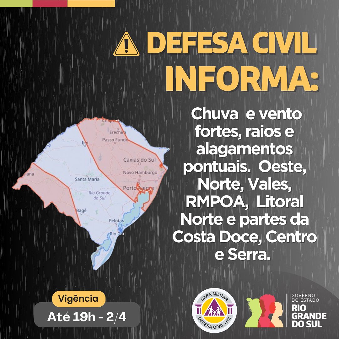 A Defesa Civil emitiu um alerta sobre a possibilidade de chuvas intensas, ventos fortes, raios e alagamentos nos próximos dias. Diante do risco de tempo severo, a recomendação é para que a população tome medidas preventivas e fique atenta às atualizações meteorológicas.