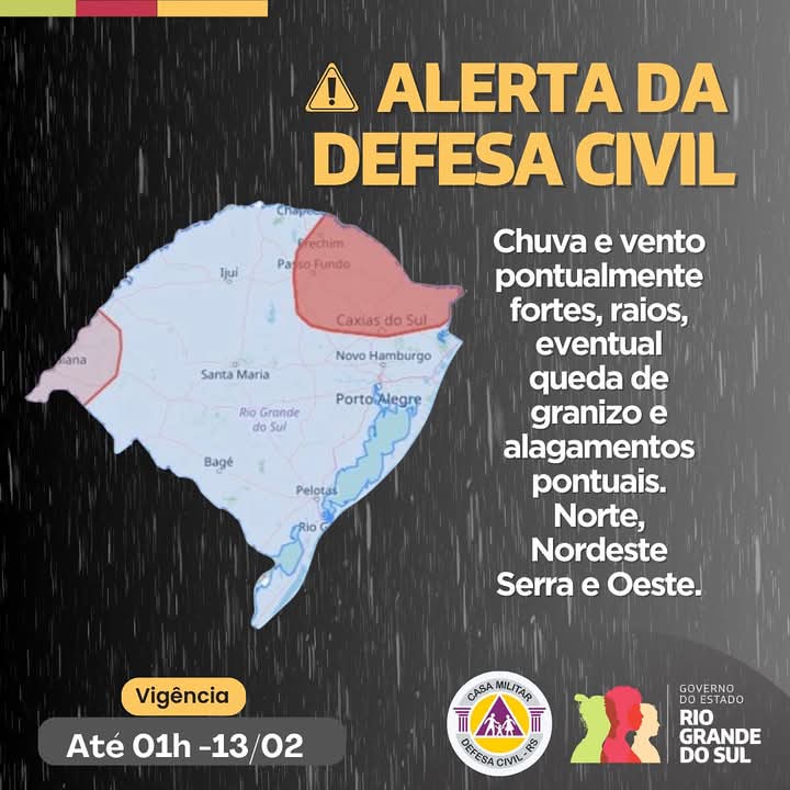 O alerta é válido ate a 1 hora desta quinta-feira (13) A Defesa Civil emitiu um alerta para a possibilidade de temporais acompanhados de chuva intensa, rajadas de vento pontualmente fortes, descargas elétricas e eventual queda de granizo. Há risco de alagamentos em pontos vulneráveis.