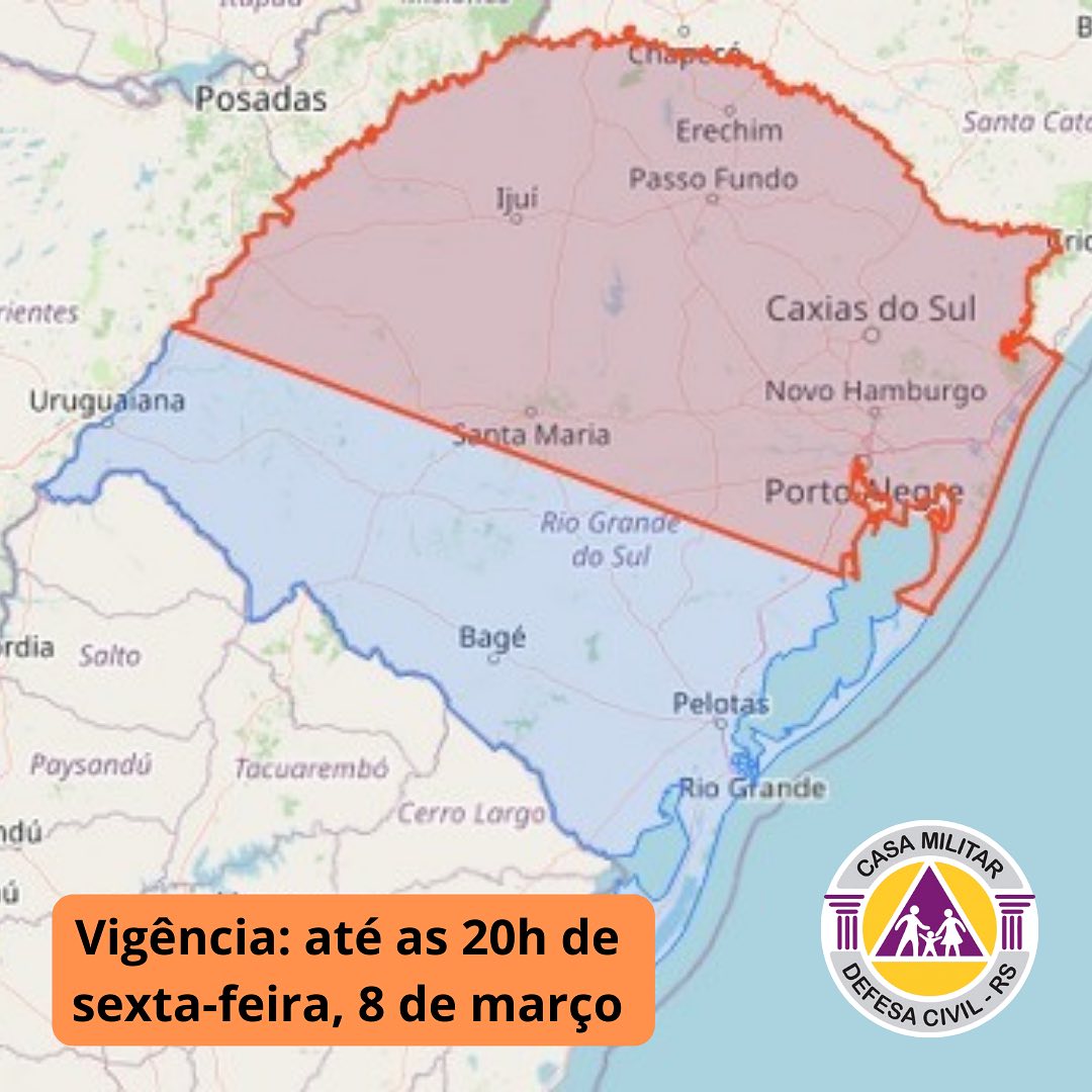 Alerta vale para a área em vermelho no mapa A Defesa Civil do Rio Grande do Sul emitiu um alerta sobre a iminência de chuvas e ventos pontualmente fortes, acompanhados por descargas elétricas, válido até as 20h desta sexta-feira, dia 8 de março.