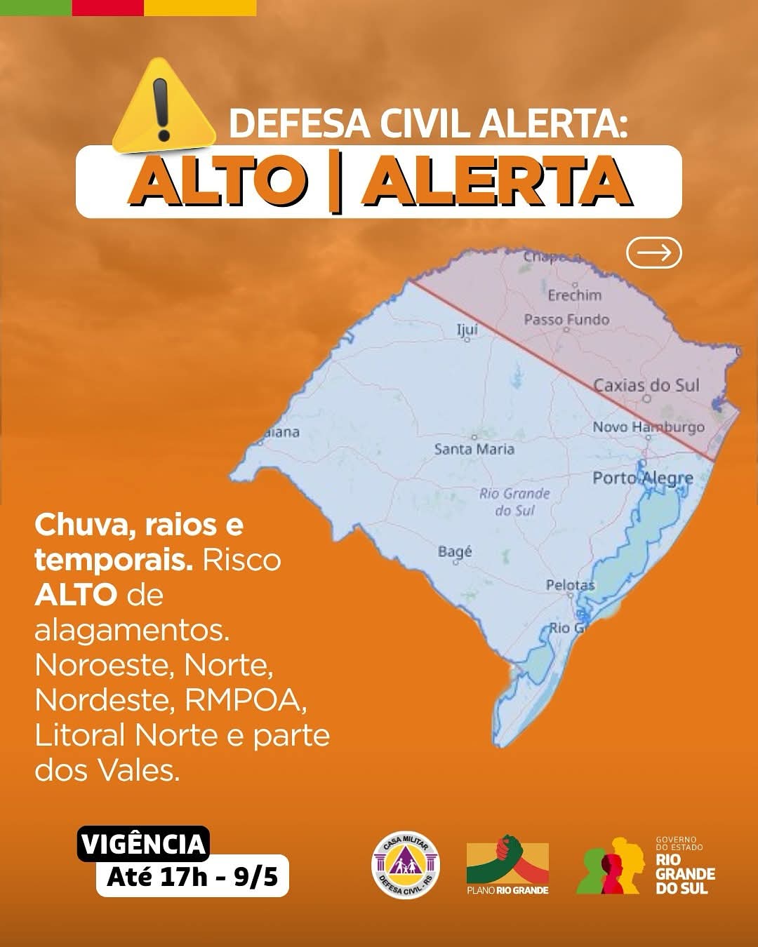 O alerta, que segue vigente até as 17h desta sexta-feira (9), aponta para a possibilidade de alagamentos em áreas do Noroeste, Norte, Nordeste, Região Metropolitana de Porto Alegre (RMPOA), Litoral Norte e parte dos Vales.