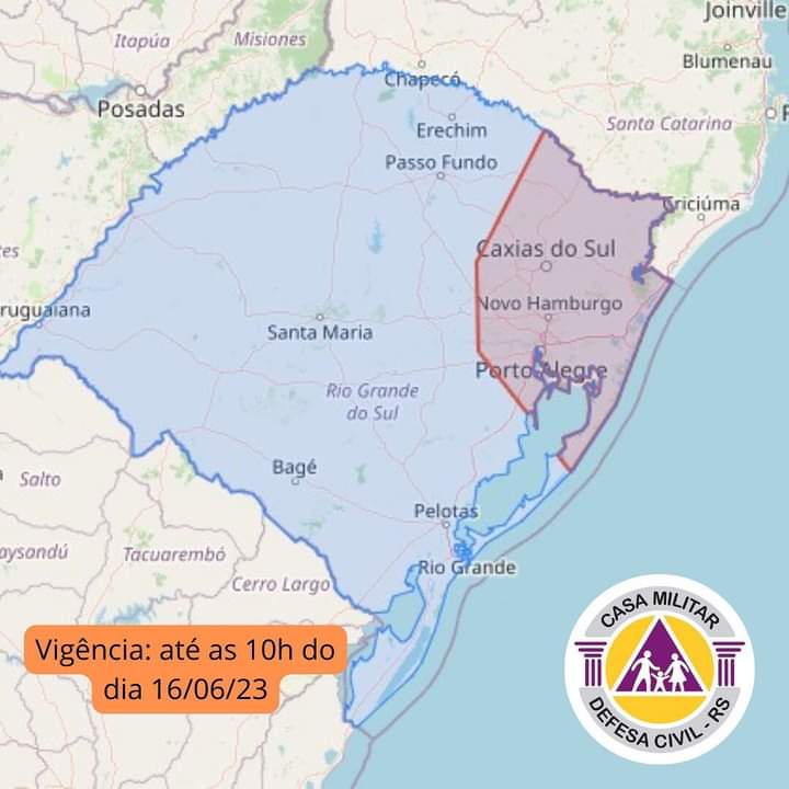 Alerta é válido até as 10h desta sexta-feira Por volta das 16h desta quinta-feira a Defesa Civil Estadual emitiu alerta para chuvas intensas e volumosas com risco de enxurrada nas áreas em vermelho do mapa. Há possibilidade de enchente nos rios Caí e Sinos. O alerta é válido até às 10h desta sexta-feira (16).