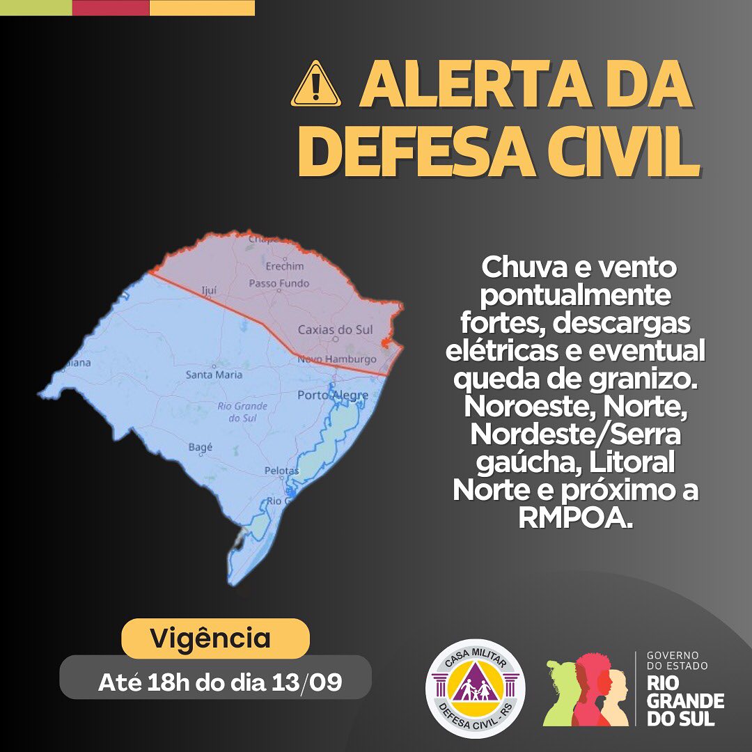 A Defesa Civil emitiu um alerta para chuvas pontualmente fortes, descargas elétricas e possibilidade de queda de granizo em várias regiões do Rio Grande do Sul, incluindo o Norte, Noroeste, Nordeste, Serra Gaúcha, Litoral Norte e áreas próximas à Região Metropolitana de Porto Alegre. O alerta é válido até as 18h desta sexta-feira.
