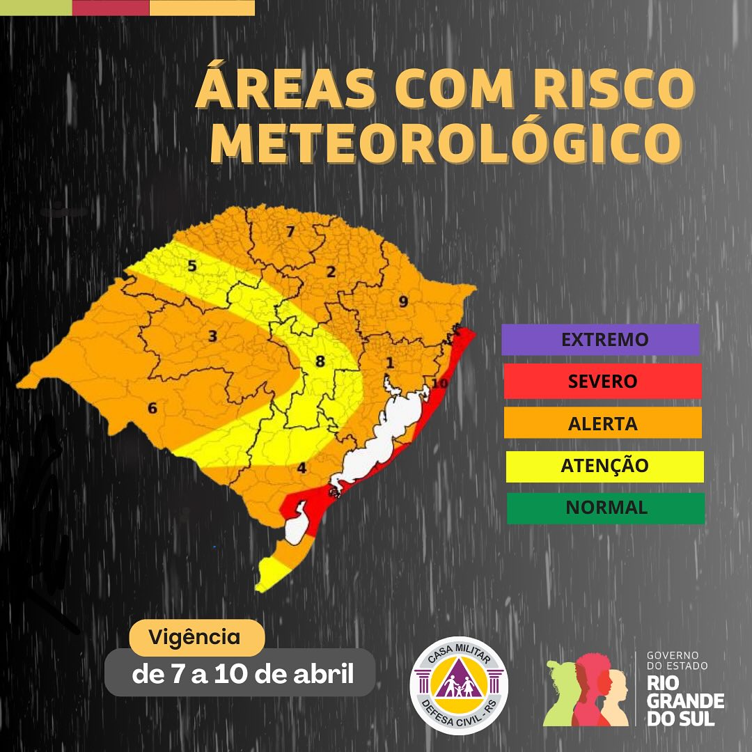 O aviso aponta que diversas regiões permanecem sob alerta (nível laranja), incluindo o Oeste, parte da Campanha, Centro, Serra, Costa Doce, Noroeste, Norte, Nordeste, parte dos Vales e a Região Metropolitana de Porto Alegre (RMPOA)