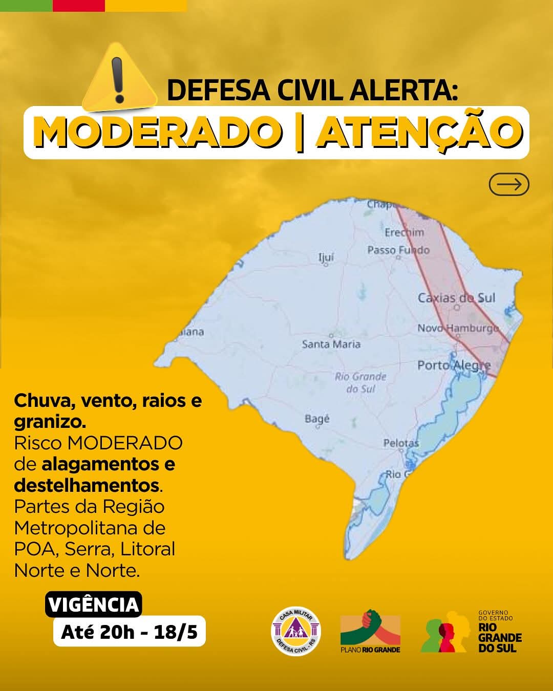 A Defesa Civil do Rio Grande do Sul emitiu um alerta de severidade amarela, com risco moderado para temporais neste domingo (18), válido até às 20h. As regiões sob atenção são: Metropolitana de Porto Alegre, Serra Gaúcha, Litoral Norte e Norte do Estado.