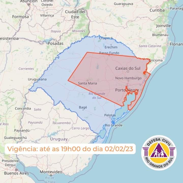 Alerta é válido para a área em vermelho no mapa Por volta das 14h desta quinta-feira a Defesa civil emitiu alerta de temporais. Com a evolução das instabilidades, a Defesa Civil alerta para chuva forte acompanhada de descargas elétricas, ventos de até 80 km/h e eventual queda de granizo nas áreas em vermelho do mapa.