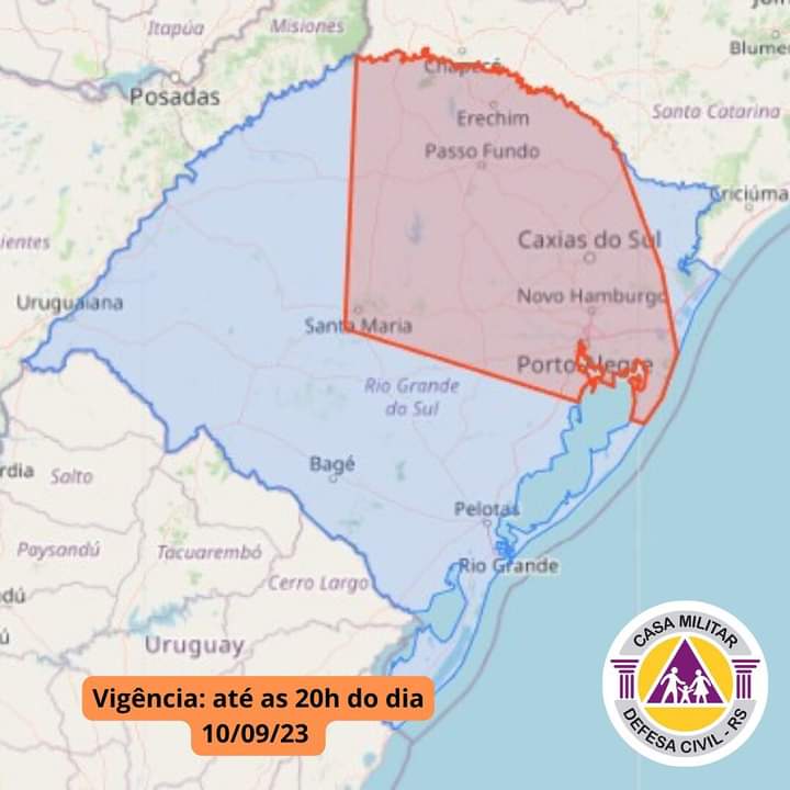 Alerta vale até às 20 horas Por voltas do meio-dia deste domingo (10) a defesa civil do Rio Grande do Sul emitiu alerta temporais pontuais, chuva forte, descargas elétricas e eventual queda de granizo. O alerta é válido até 20h deste domingo na área em vermelho no mapa. Em caso de emergência ligue 190/193.
