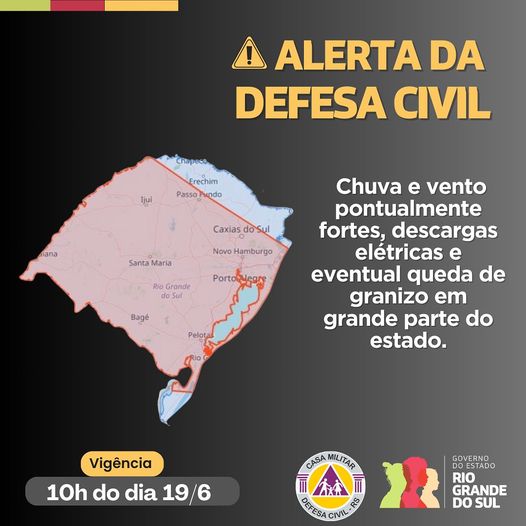 Alerta válido até as 10 horas desta quarta-feira, 19 de junho A Defesa Civil emitiu um alerta para a ocorrência de tempestade com chuva e vento pontualmente fortes, descargas elétricas e eventual queda de granizo em parte do Estado.