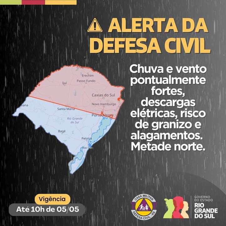 Alerta vale até as 10 horas para toda a área em vermelho no mapa A Defesa Civil emitiu um alerta para a ocorrência de chuvas e ventos fortes, descargas elétricas e risco de granizo, válido até as 10h de domingo, 5 de maio.