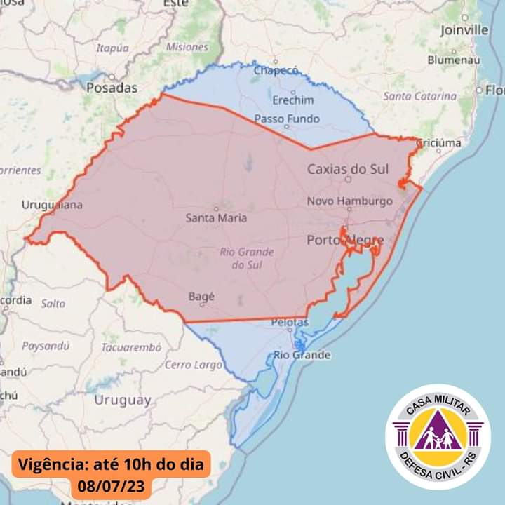 Alerta é válido para a área em vermelho no mapa No fim da tarde desta sexta-feira a Defesa Civil do Rio Grande do Sul emitiu alerta para chuvas intensas e volumosas com risco de enxurradas nas cabeceiras de rios. O alerta é válido até às 10 horas deste sábado, 08 de julho.