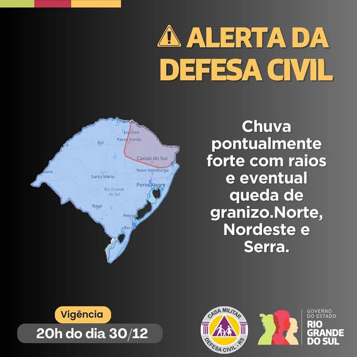 O aviso é válido até as 20h de hoje A Defesa Civil do Rio Grande do Sul emitiu um alerta para a possibilidade de chuvas intensas, acompanhadas de raios, granizo e alagamentos pontuais, válido até as 20h de hoje.